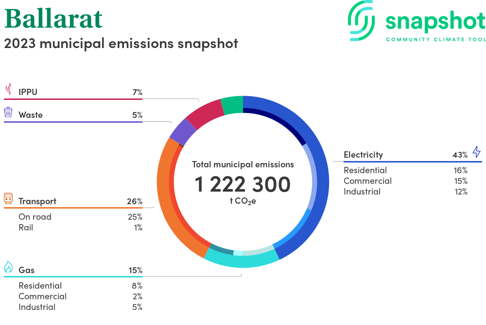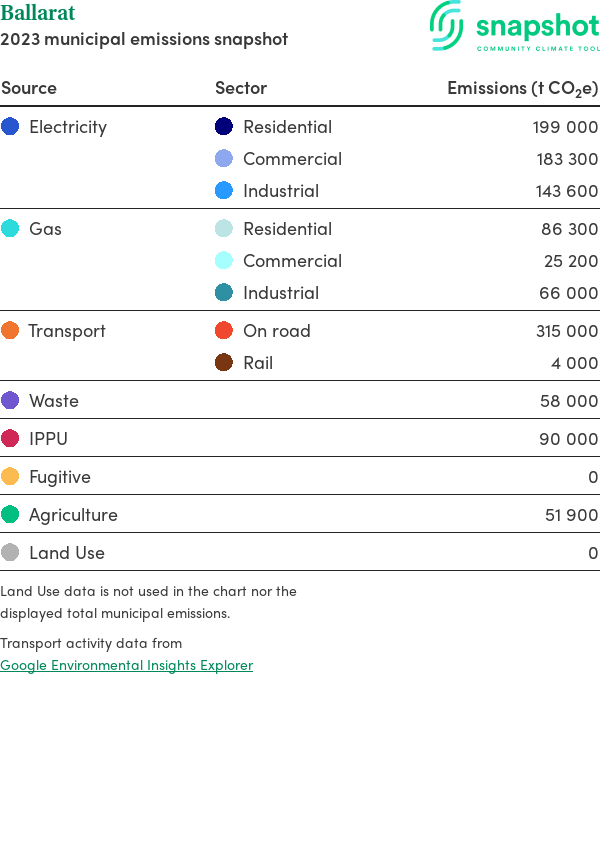 Ballarat is a city that is geographically small relative to the state average and has a moderate urban density. Its major emissions source is electricity consumption, due to the community’s scale of population and commercial activity. The second largest source of emissions is on road transportation.