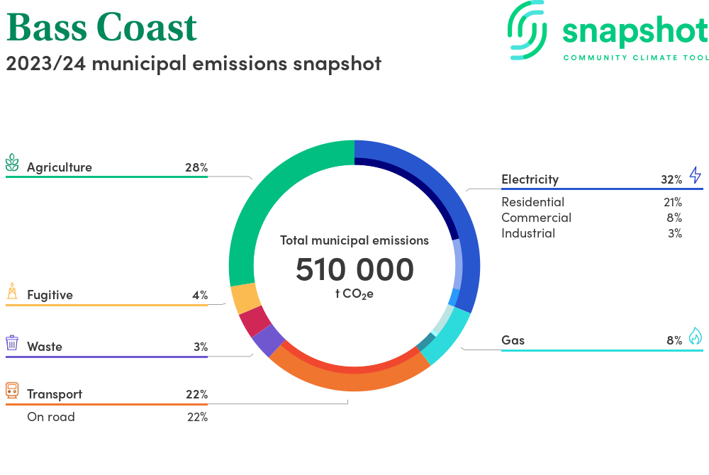 Bass Coast is a rural municipality that is geographically small relative to the state average and has a moderate urban density. Its major emissions source is electricity consumption, due to the community’s scale of population and commercial activity. The second largest source of emissions is agriculture.