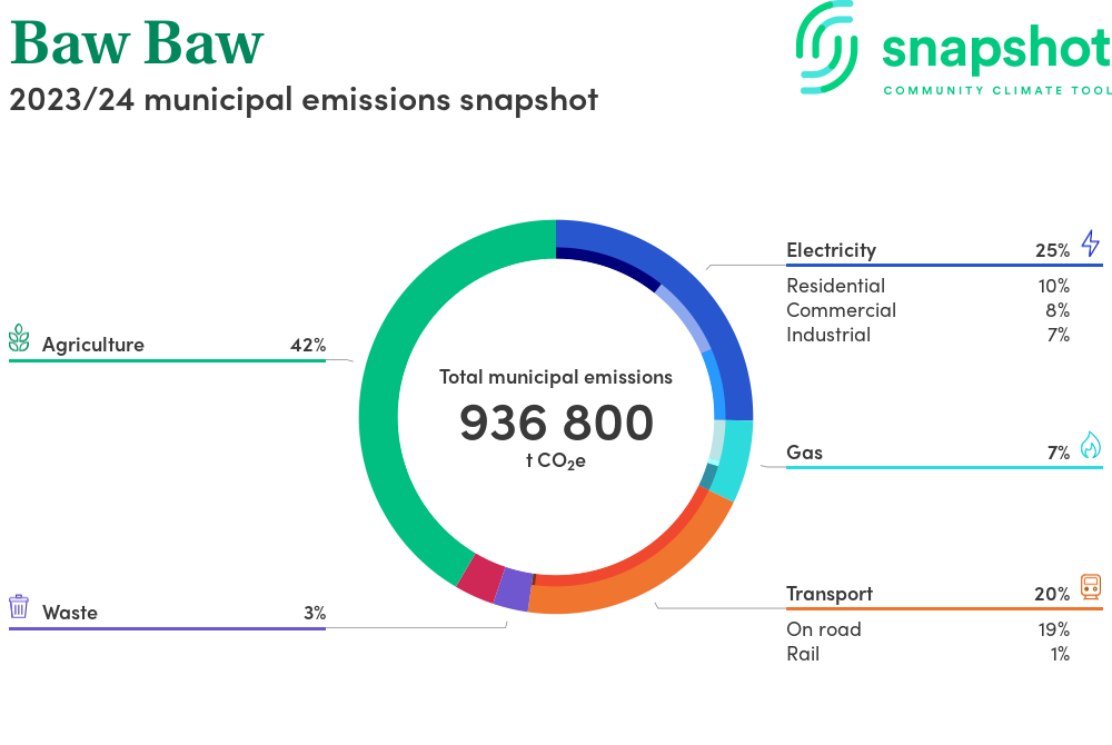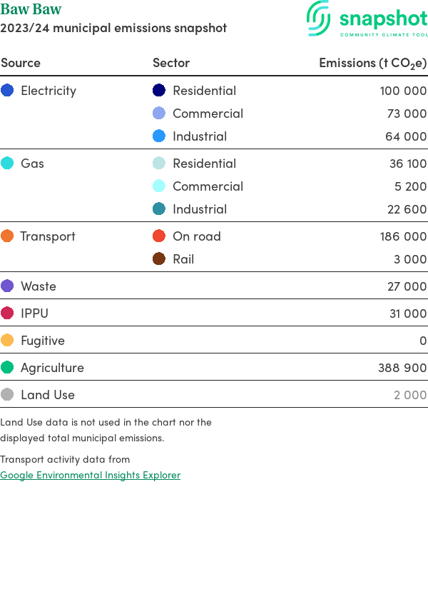 Baw Baw is a rural municipality that is moderate in size relative to the state average and has a low urban density. Its major emissions source is agriculture, due to the community’s relatively large amount of agricultural activity and low population. The second largest source of emissions is electricity consumption.