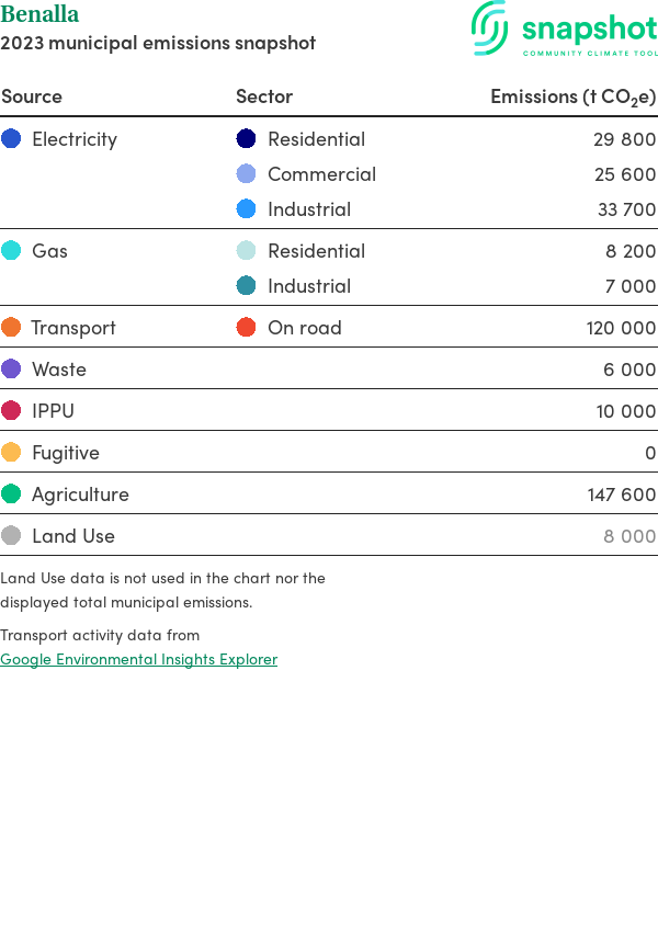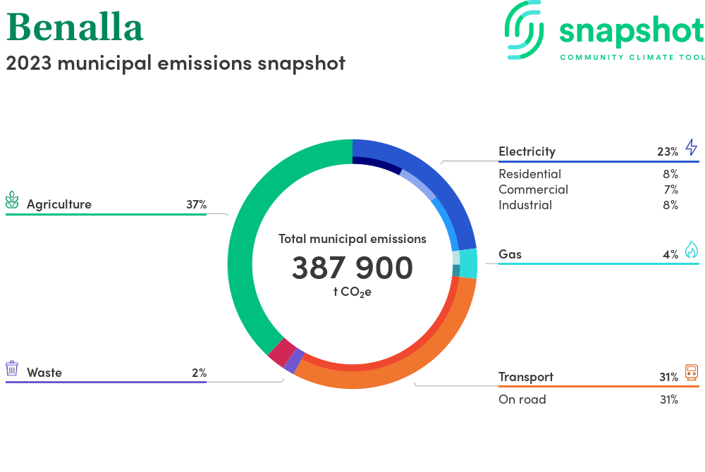 Benalla is a rural city that is geographically small relative to the state average and has a low urban density. Its major emissions source is agriculture, due to the community’s relatively large amount of agricultural activity and low population. The second largest source of emissions is on road transportation.