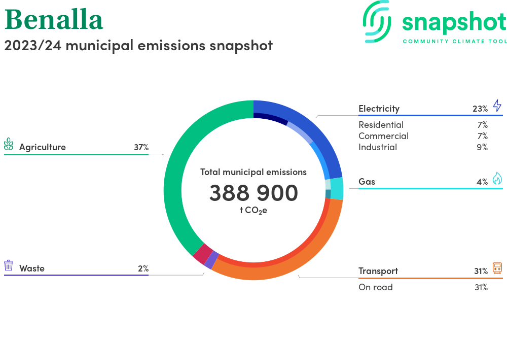 Benalla is a rural city that is geographically small relative to the state average and has a low urban density. Its major emissions source is agriculture, due to the community’s relatively large amount of agricultural activity and low population. The second largest source of emissions is on road transportation.