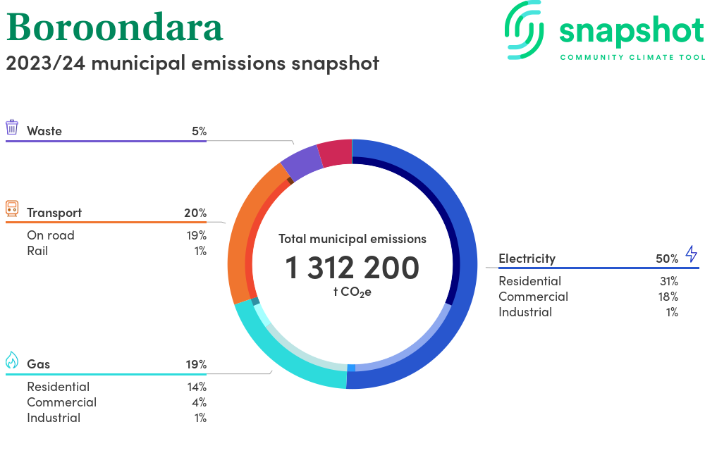 Boroondara is a city that is geographically very small relative to the state average and has a high urban density. Its major emissions source is electricity consumption with the majority of this coming from residential electricity consumption.
