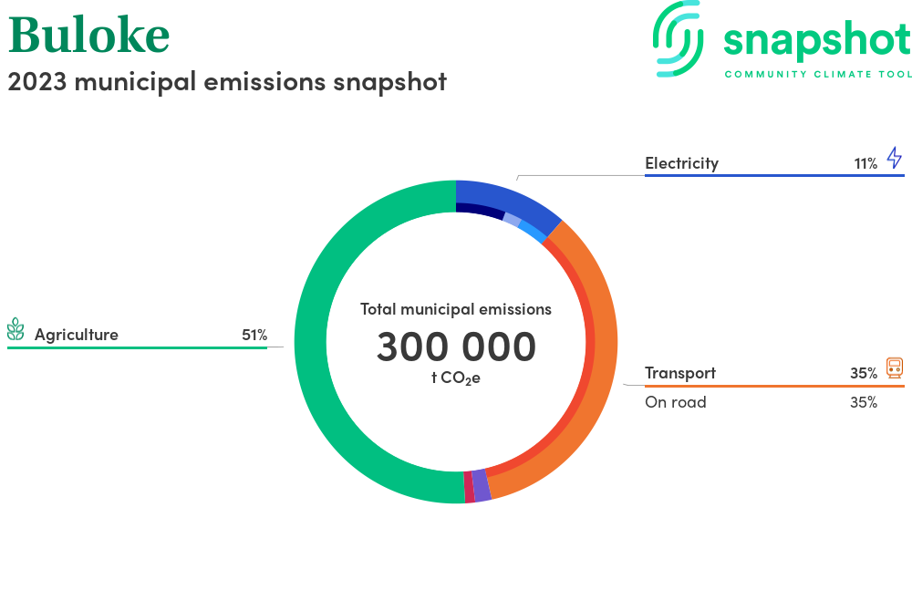 Buloke is a rural municipality that is large in geographical area relative to the state average and has a very low urban density. Its major emissions source is agriculture, due to the community’s relatively large amount of agricultural activity and low population. The second largest source of emissions is on road transportation.