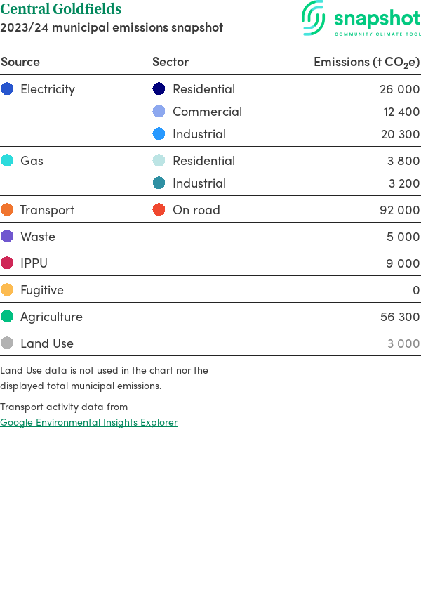 Central Goldfields is a rural municipality that is geographically small relative to the state average and has a low urban density. Its major emissions source is on road transportation, due to the community’s larger commuting and other travel requirements. The second largest source of emissions is electricity consumption.
