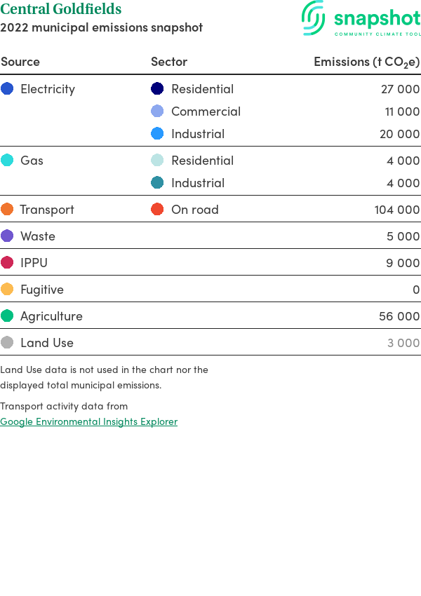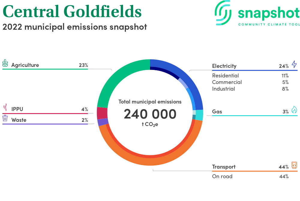 Central Goldfields is a rural municipality that is geographically small relative to the state average and has a low urban density. Its major emissions source is on road transportation, due to the community’s larger commuting and other travel requirements. The second largest source of emissions is electricity consumption.