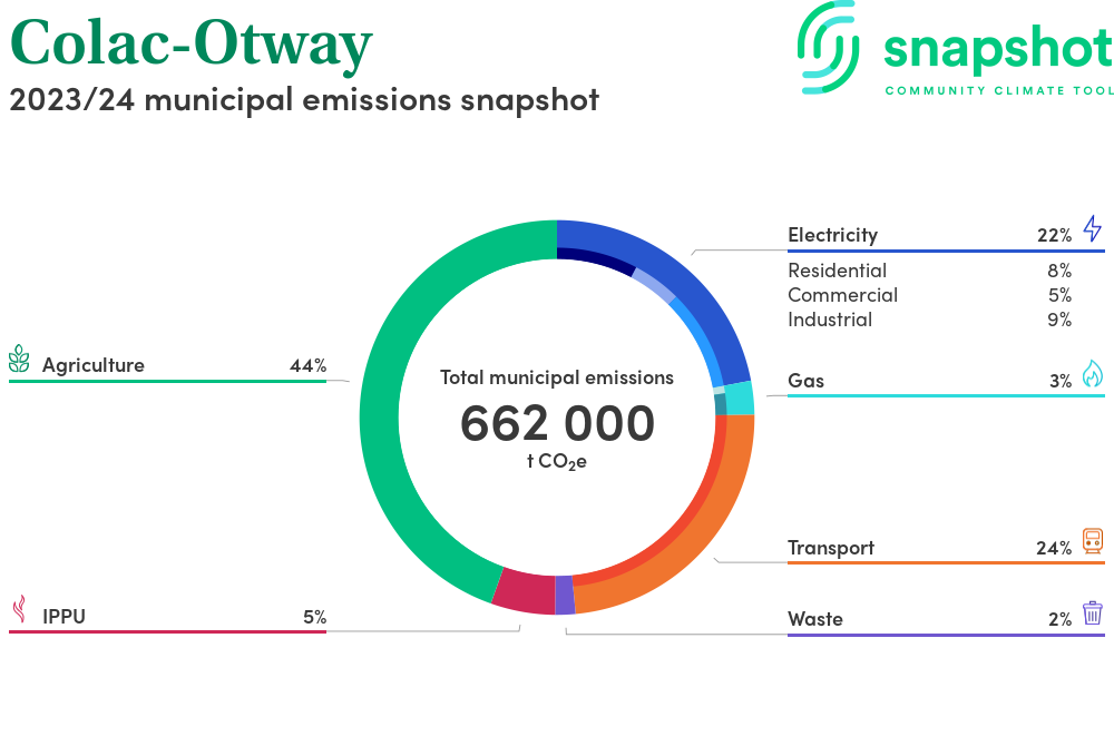 Colac-Otway is a rural municipality that is moderate in size relative to the state average and has a low urban density. Its major emissions source is agriculture, due to the community’s relatively large amount of agricultural activity and low population. The second largest source of emissions is electricity consumption.