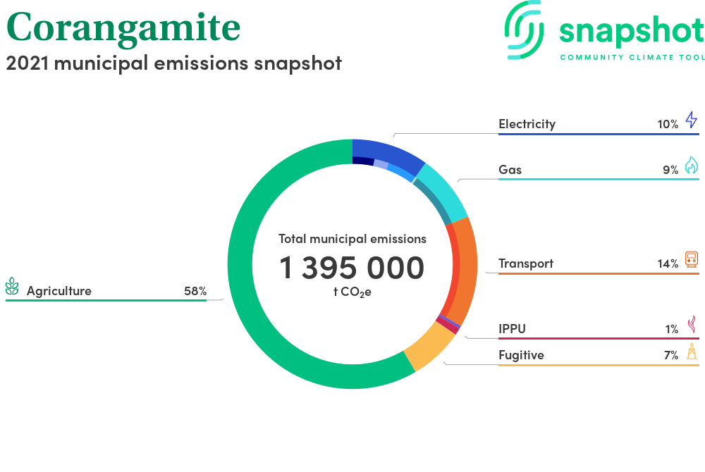 Corangamite is a rural municipality that is moderate in size relative to the state average and has a low urban density. Its major emissions source is agriculture, due to the community’s relatively large amount of agricultural activity and low population. The second largest source of emissions is on road transportation.