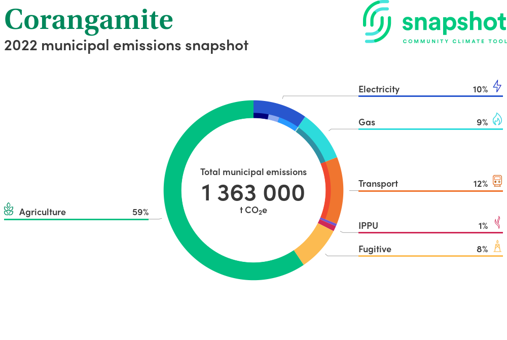 Corangamite is a rural municipality that is moderate in size relative to the state average and has a low urban density. Its major emissions source is agriculture, due to the community’s relatively large amount of agricultural activity and low population. The second largest source of emissions is electricity consumption.