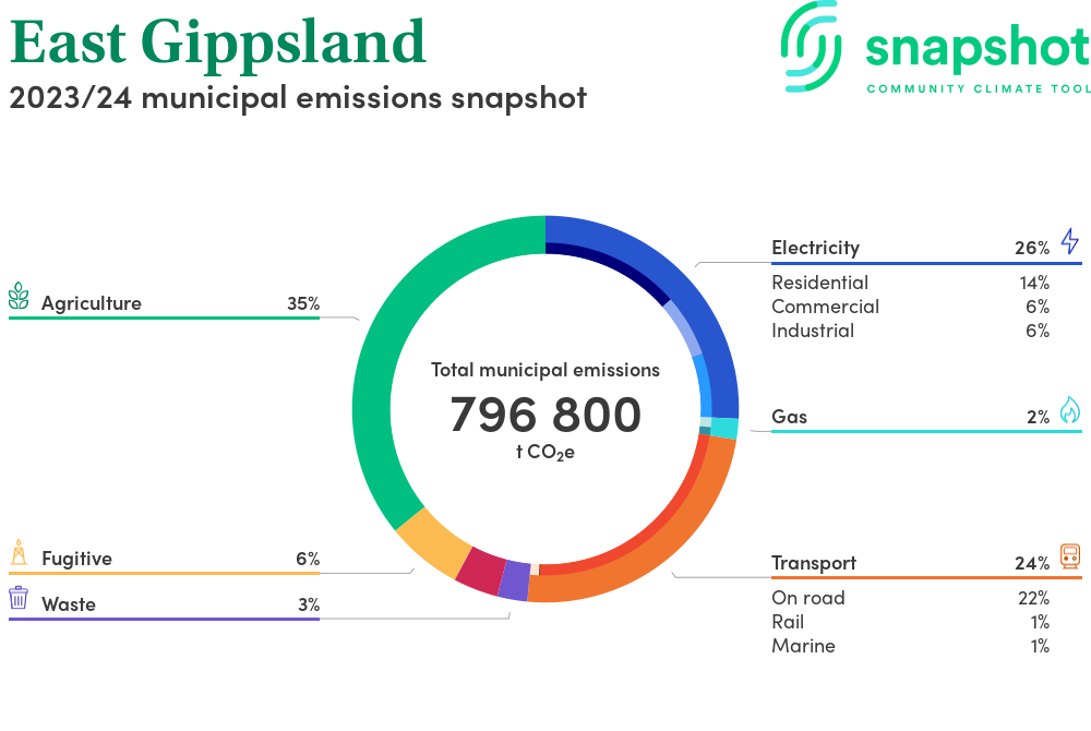 East Gippsland is a rural municipality that is large in geographical area relative to the state average and has a very low urban density. Its major emissions source is agriculture, due to the community’s relatively large amount of agricultural activity and low population. The second largest source of emissions is electricity consumption.