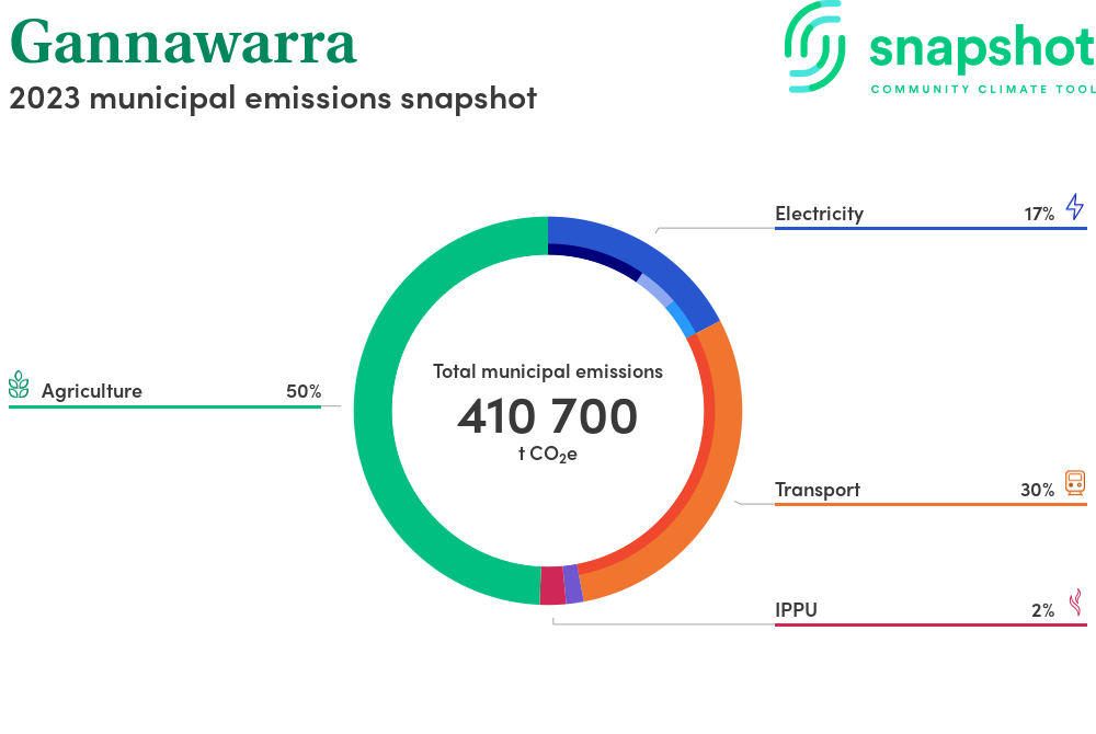 Gannawarra is a rural municipality that is moderate in size relative to the state average and has a low urban density. Its major emissions source is agriculture, due to the community’s relatively large amount of agricultural activity and low population. The second largest source of emissions is on road transportation.