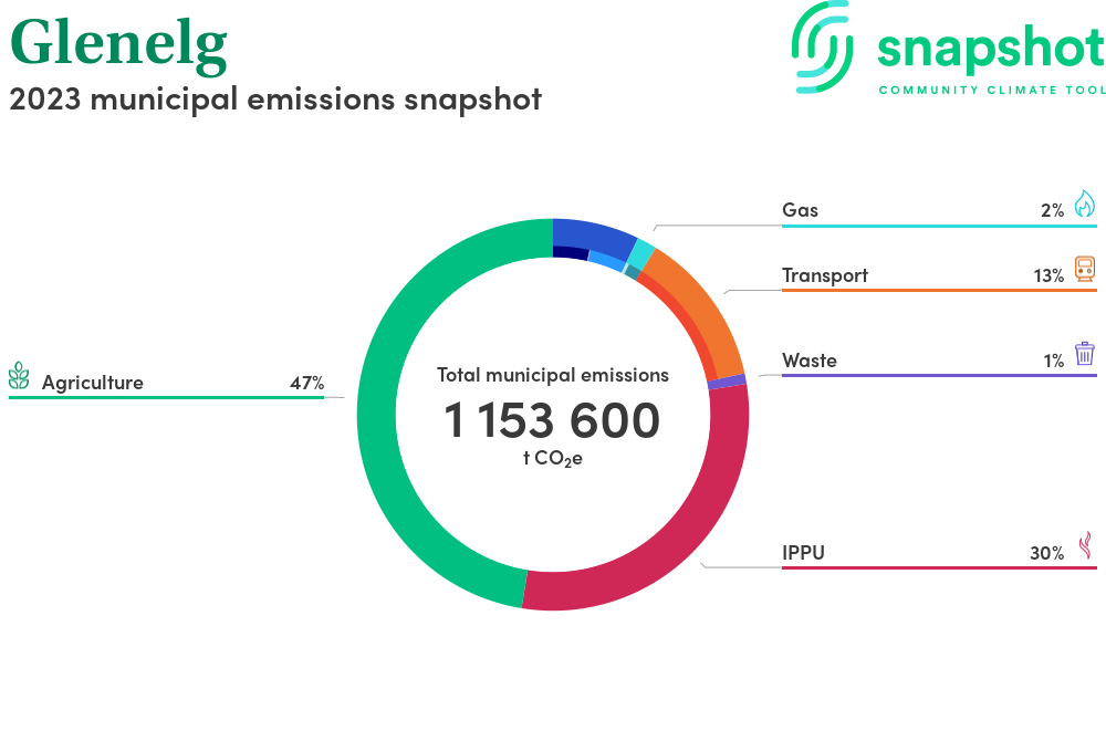 Glenelg is a rural municipality that is moderate in size relative to the state average and has a low urban density. Its major emissions source is agriculture, due to the community’s relatively large amount of agricultural activity and low population. The second largest source of emissions is industrial processes.