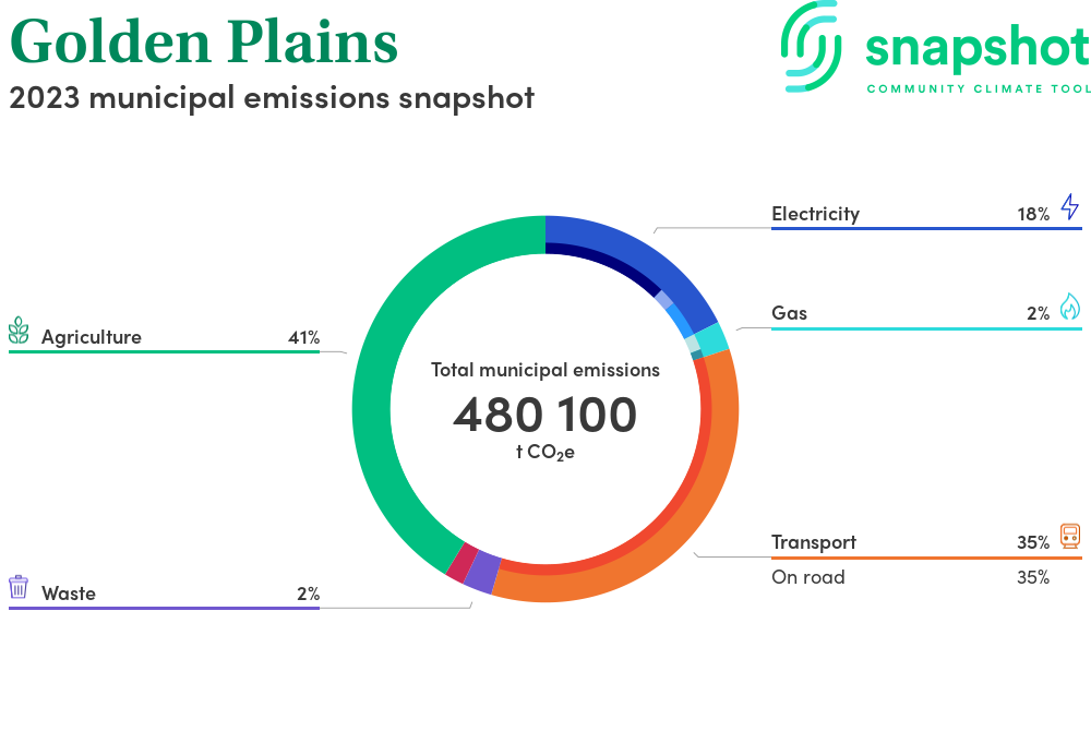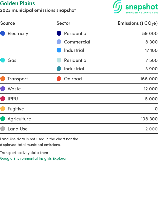 Golden Plains is a rural municipality that is moderate in size relative to the state average and has a low urban density. Its major emissions source is agriculture, due to the community’s relatively large amount of agricultural activity and low population. The second largest source of emissions is on road transportation.