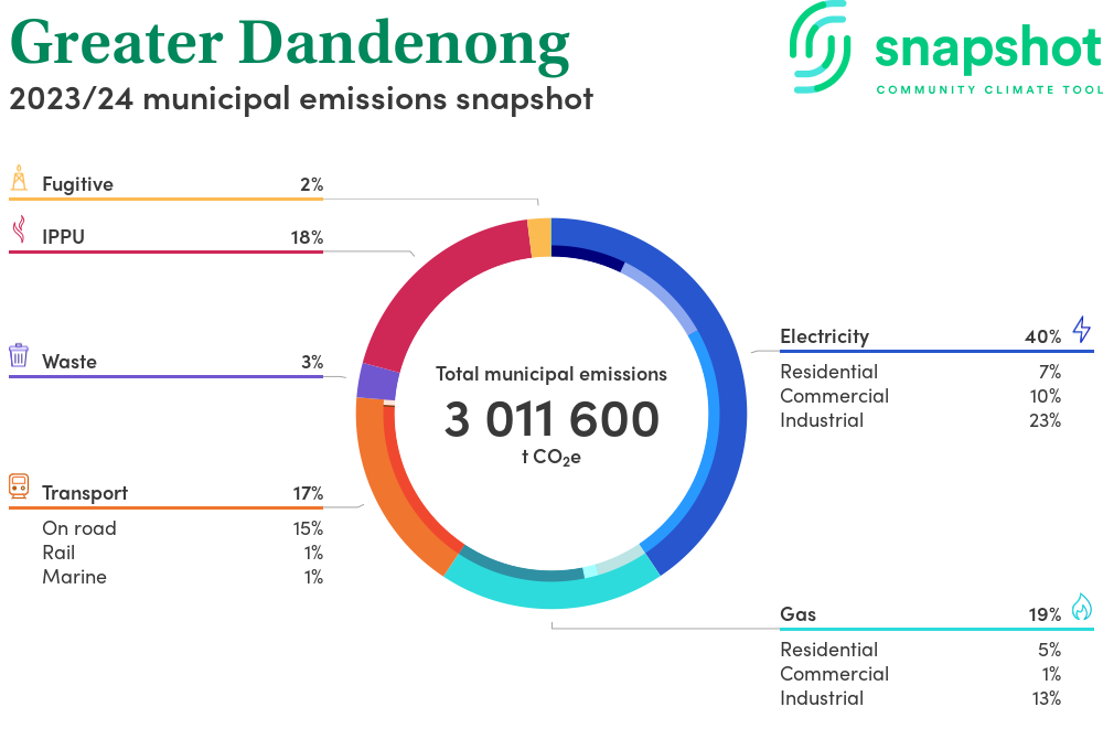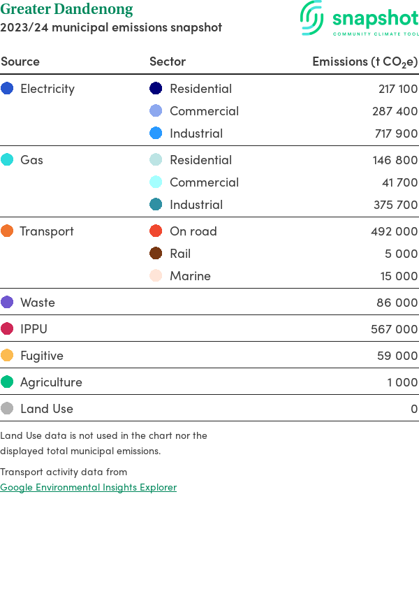 Greater Dandenong is a city that is geographically small relative to the state average and has a high urban density. Its major emissions source is electricity consumption with the majority of this coming from industrial electricity consumption.