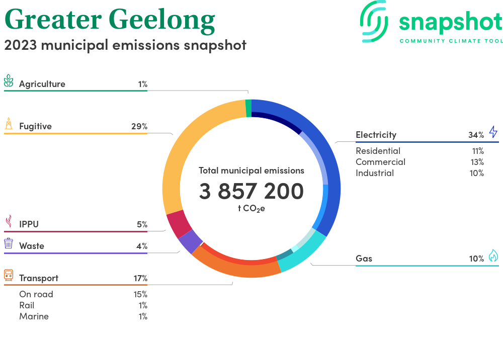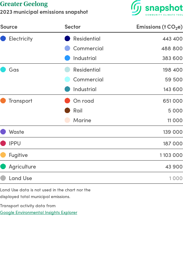 Greater Geelong is a city that is geographically small relative to the state average and has a moderate urban density. Its major emissions source is electricity consumption, due to the community’s scale of population and commercial activity. The second largest source of emissions is oil and natural gas.