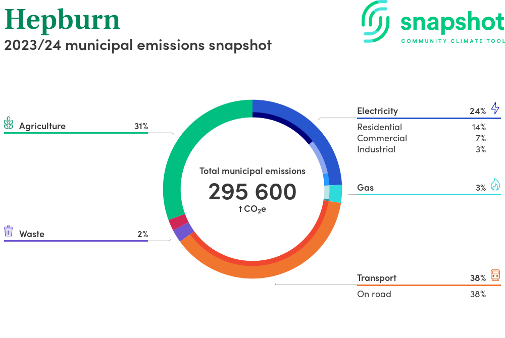 Hepburn is a rural municipality that is geographically small relative to the state average and has a low urban density. Its major emissions source is on road transportation, due to the community’s larger commuting and other travel requirements. The second largest source of emissions is agriculture.
