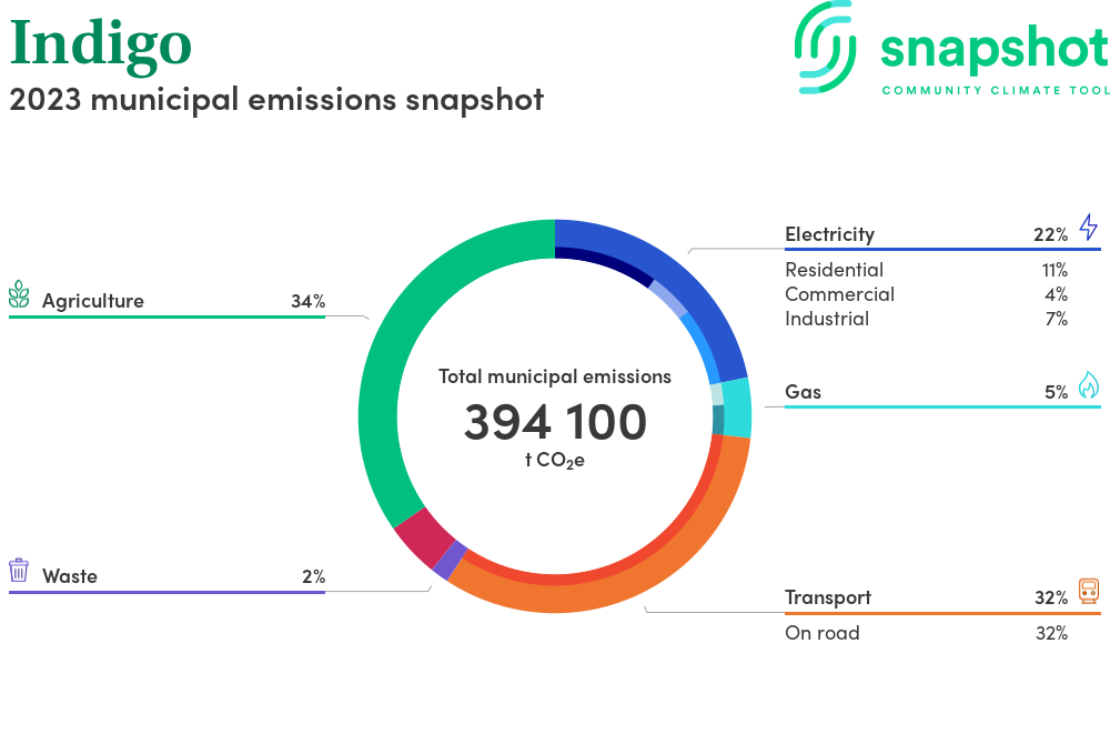 Indigo is a rural municipality that is geographically small relative to the state average and has a low urban density. Its major emissions source is agriculture, due to the community’s relatively large amount of agricultural activity and low population. The second largest source of emissions is on road transportation.