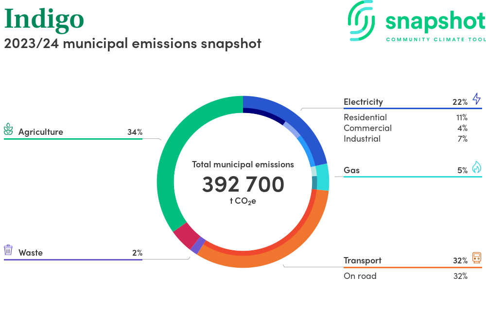 Indigo is a rural municipality that is geographically small relative to the state average and has a low urban density. Its major emissions source is agriculture, due to the community’s relatively large amount of agricultural activity and low population. The second largest source of emissions is on road transportation.