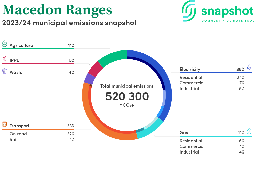 Macedon Ranges is a rural municipality that is geographically small relative to the state average and has a moderate urban density. Its major emissions source is electricity consumption, due to the community’s scale of population and commercial activity. The second largest source of emissions is on road transportation.