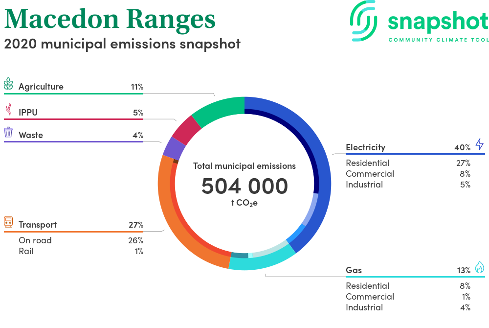 Macedon Ranges is a rural municipality that is geographically small relative to the state average and has a moderate urban density. Its major emissions source is electricity consumption with the majority of this coming from residential electricity consumption.