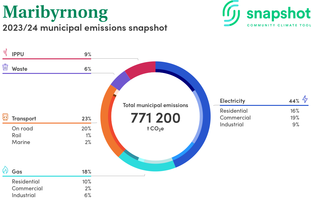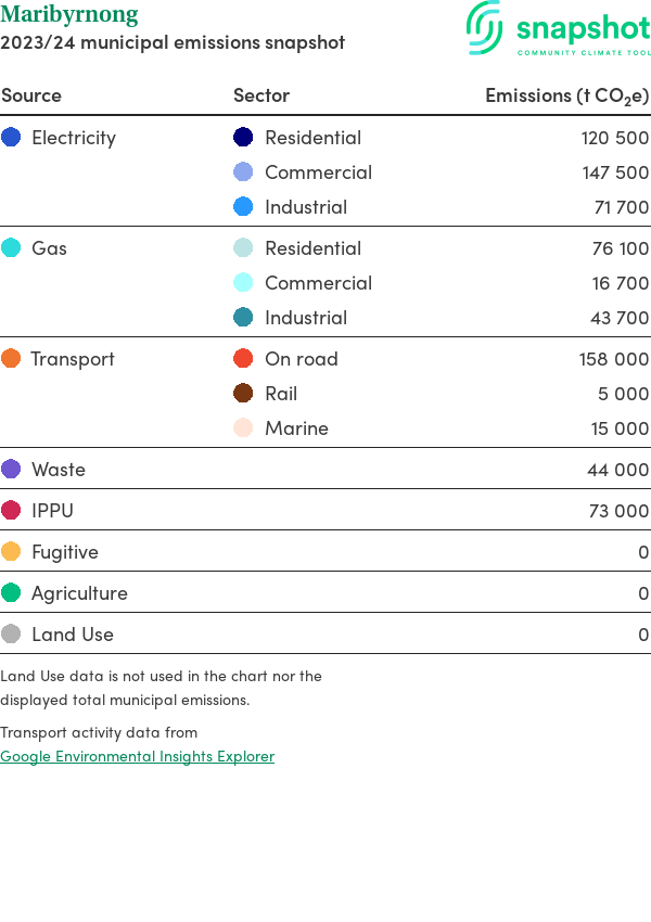 Maribyrnong is a city that is geographically very small relative to the state average and has a very high urban density. Its major emissions source is electricity consumption with the majority of this coming from commercial electricity consumption.