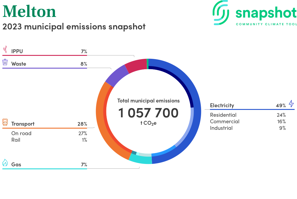 Melton is a city that is geographically small relative to the state average and has a moderate urban density. Its major emissions source is electricity consumption with the majority of this coming from residential electricity consumption.