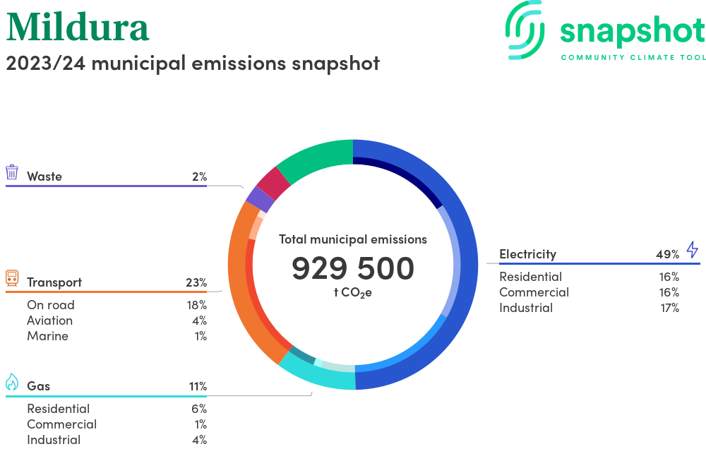 Mildura is a rural city that is large in geographical area relative to the state average and has a very low urban density. Its major emissions source is electricity consumption with the majority of this coming from commercial electricity consumption.
