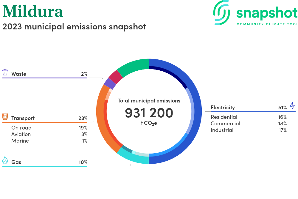 Mildura is a rural city that is large in geographical area relative to the state average and has a very low urban density. Its major emissions source is electricity consumption with the majority of this coming from commercial electricity consumption.