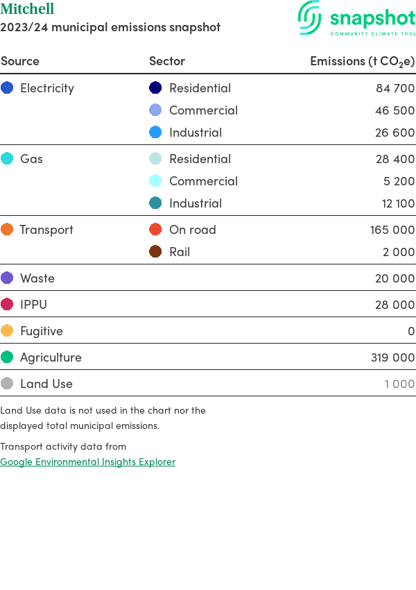 This report outlines the major sources of carbon emissions for the entire region (municipality, electorate, or state). Due to the approximate nature of the profile, the emission values are represented as rounded numbers. This report includes the following sources: