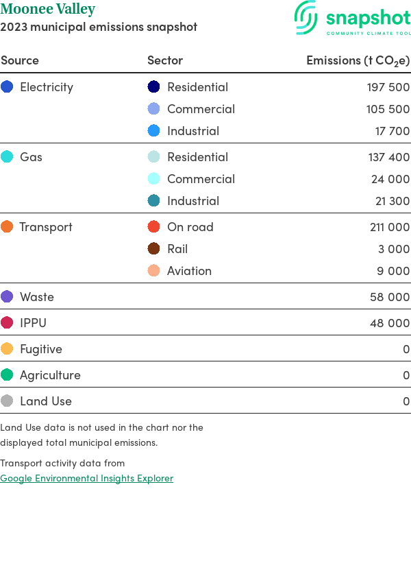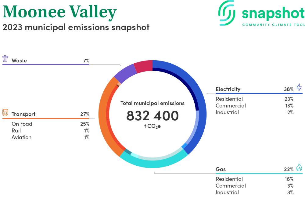 Moonee Valley is a city that is geographically very small relative to the state average and has a very high urban density. Its major emissions source is electricity consumption, due to the community’s scale of population and commercial activity. The second largest source of emissions is gas consumption.
