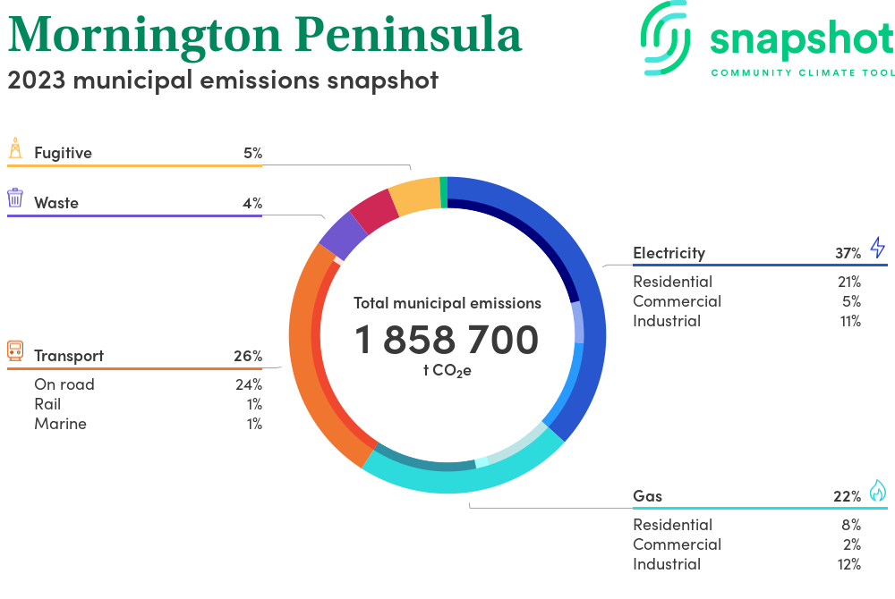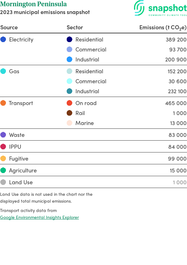 Mornington Peninsula is a rural municipality that is geographically small relative to the state average and has a moderate urban density. Its major emissions source is electricity consumption, due to the community’s scale of population and commercial activity. The second largest source of emissions is gas consumption.