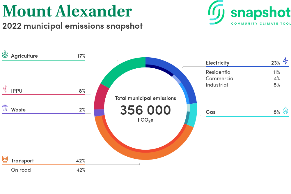Mount Alexander is a rural municipality that is geographically small relative to the state average and has a low urban density. Its major emissions source is on road transportation, due to the community’s larger commuting and other travel requirements. The second largest source of emissions is electricity consumption.