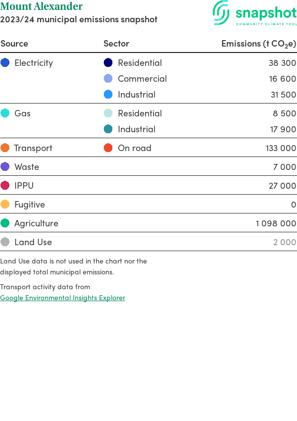 This report outlines the major sources of carbon emissions for the entire region (municipality, electorate, or state). Due to the approximate nature of the profile, the emission values are represented as rounded numbers. This report includes the following sources: