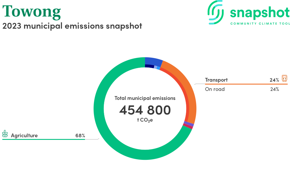 Towong is a rural municipality that is moderate in size relative to the state average and has a very low urban density. Its major emissions source is agriculture, due to the community’s relatively large amount of agricultural activity and low population. The second largest source of emissions is on road transportation.