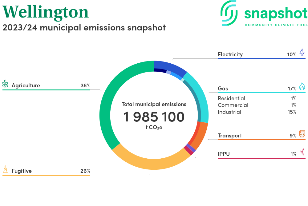 Wellington is a rural municipality that is large in geographical area relative to the state average and has a low urban density. Its major emissions source is agriculture, due to the community’s relatively large amount of agricultural activity and low population. The second largest source of emissions is oil and natural gas.