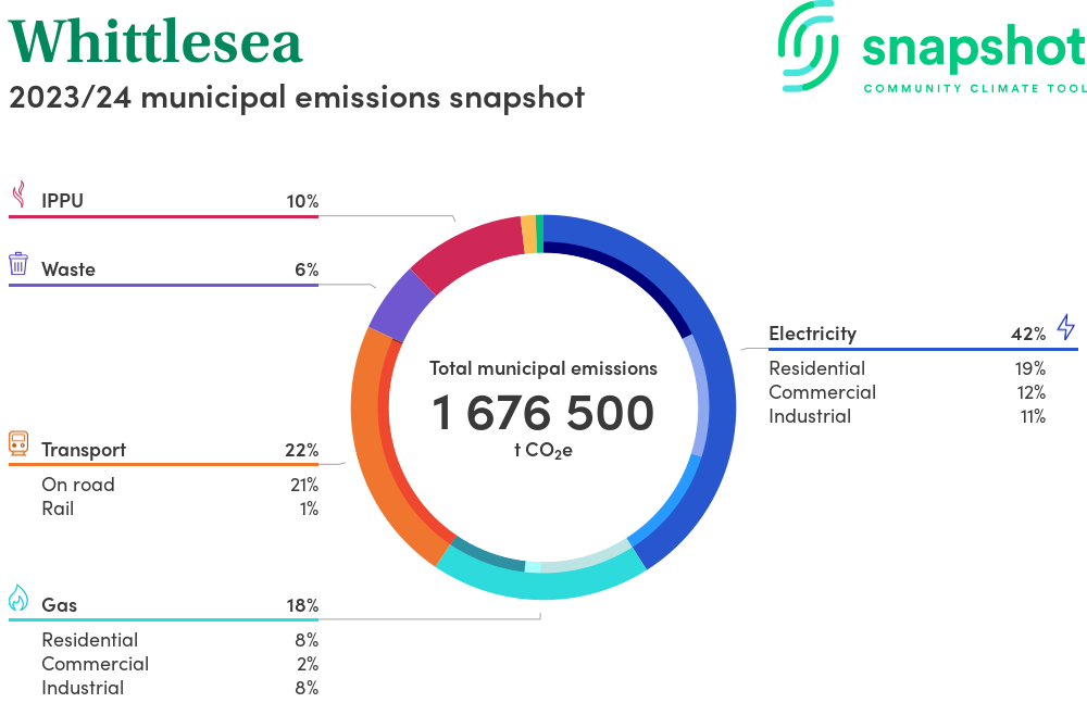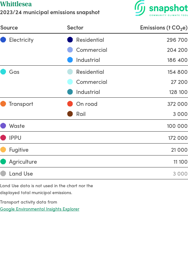 Whittlesea is a city that is geographically small relative to the state average and has a moderate urban density. Its major emissions source is electricity consumption, due to the community’s scale of population and commercial activity. The second largest source of emissions is gas consumption.