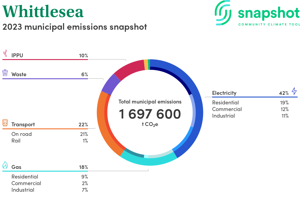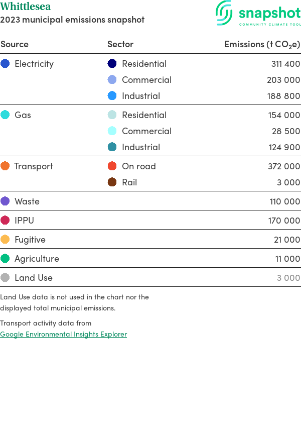 Whittlesea is a city that is geographically small relative to the state average and has a moderate urban density. Its major emissions source is electricity consumption, due to the community’s scale of population and commercial activity. The second largest source of emissions is gas consumption.