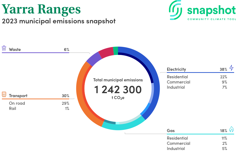 Yarra Ranges is a rural municipality that is geographically small relative to the state average and has a moderate urban density. Its major emissions source is electricity consumption, due to the community’s scale of population and commercial activity. The second largest source of emissions is on road transportation.