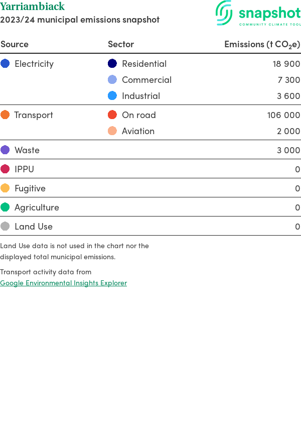 This report outlines the major sources of carbon emissions for the entire region (municipality, electorate, or state). Due to the approximate nature of the profile, the emission values are represented as rounded numbers. This report includes the following sources:
