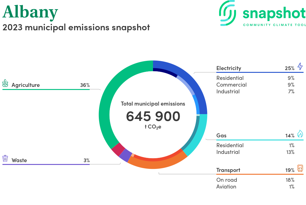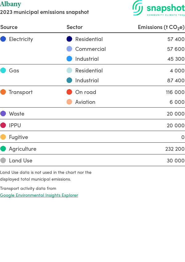 Albany is a city that is moderate in size relative to the state average and has a moderate urban density. Its major emissions source is agriculture, due to the community’s relatively large amount of agricultural activity and low population. The second largest source of emissions is electricity consumption.