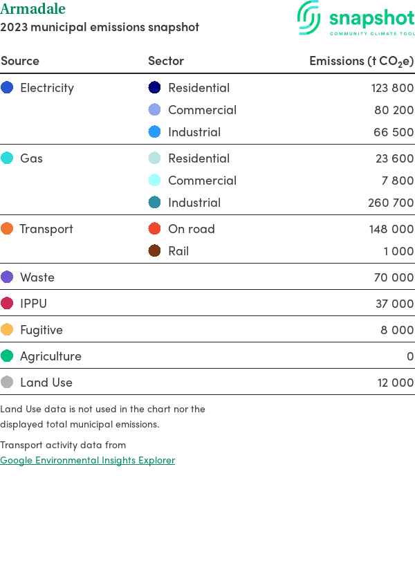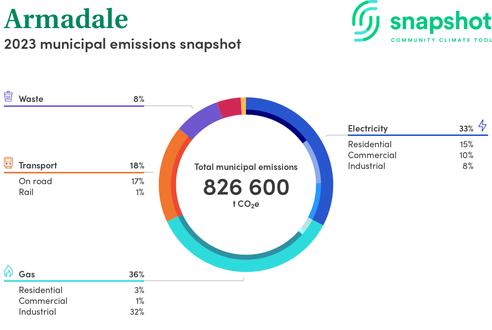 Armadale is a city that is geographically small relative to the state average and has a high urban density. Its major emissions source is gas consumption, due to the community’s relatively large population and commercial activity. The second largest source of emissions is industrial gas consumption.