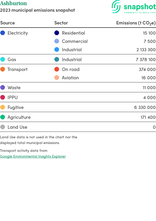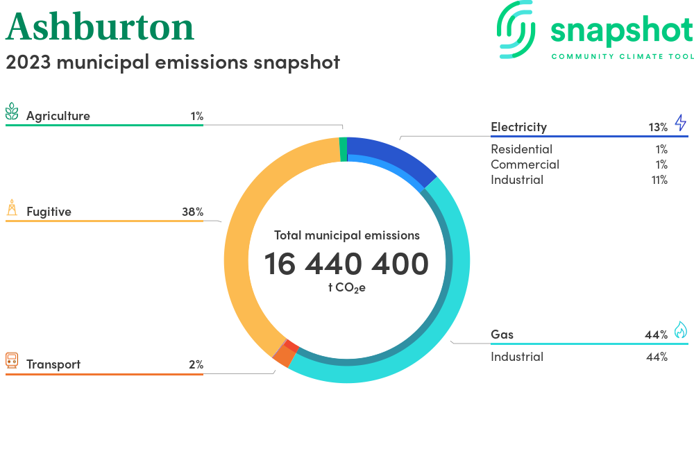 Ashburton is a rural municipality that is very large in geographical area relative to the state average and has a low urban density. Its major emissions source is industrial gas consumption, due to the community’s presence of heavy industry activity. The second largest source of emissions is oil and natural gas.