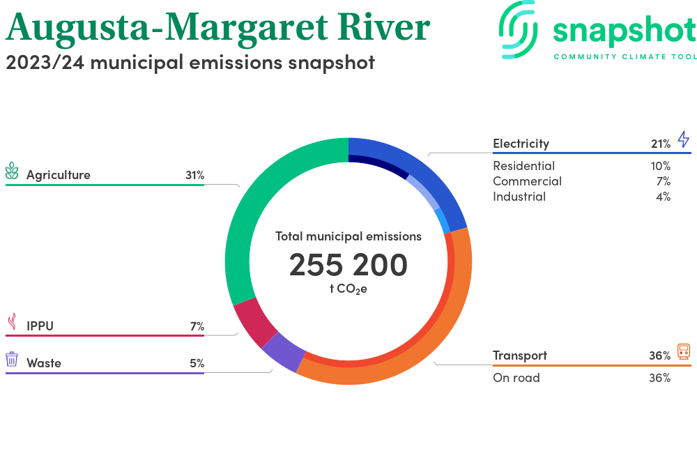 Augusta-Margaret River is a rural municipality that is geographically small relative to the state average and has a moderate urban density. Its major emissions source is agriculture, due to the community’s relatively large amount of agricultural activity and low population. The second largest source of emissions is on road transportation.
