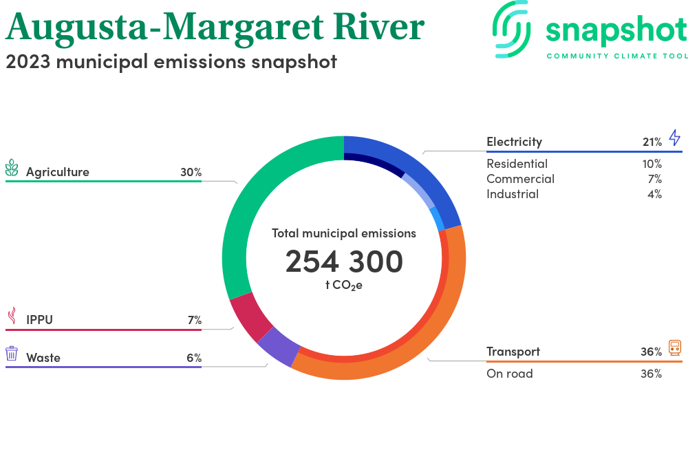Augusta-Margaret River is a rural municipality that is geographically small relative to the state average and has a moderate urban density. Its major emissions source is agriculture, due to the community’s relatively large amount of agricultural activity and low population. The second largest source of emissions is on road transportation.