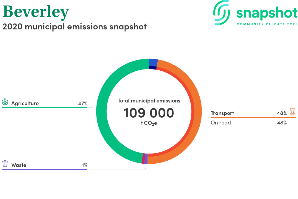 Beverley is a rural municipality that is geographically small relative to the state average and has a moderate urban density. Its major emissions source is agriculture, due to the community’s relatively large amount of agricultural activity and low population. The second largest source of emissions is on road transportation.