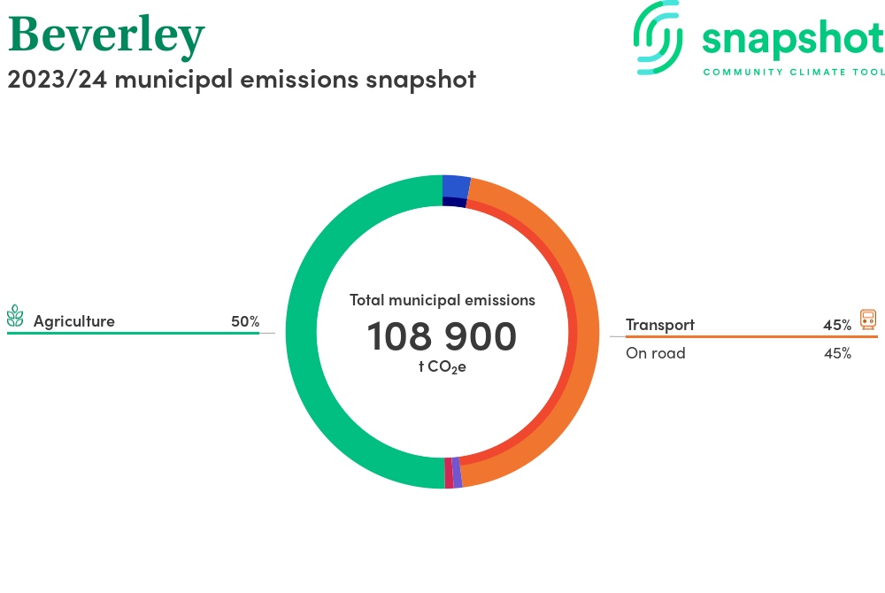 Beverley is a rural municipality that is geographically small relative to the state average and has a moderate urban density. Its major emissions source is agriculture, due to the community’s relatively large amount of agricultural activity and low population. The second largest source of emissions is on road transportation.