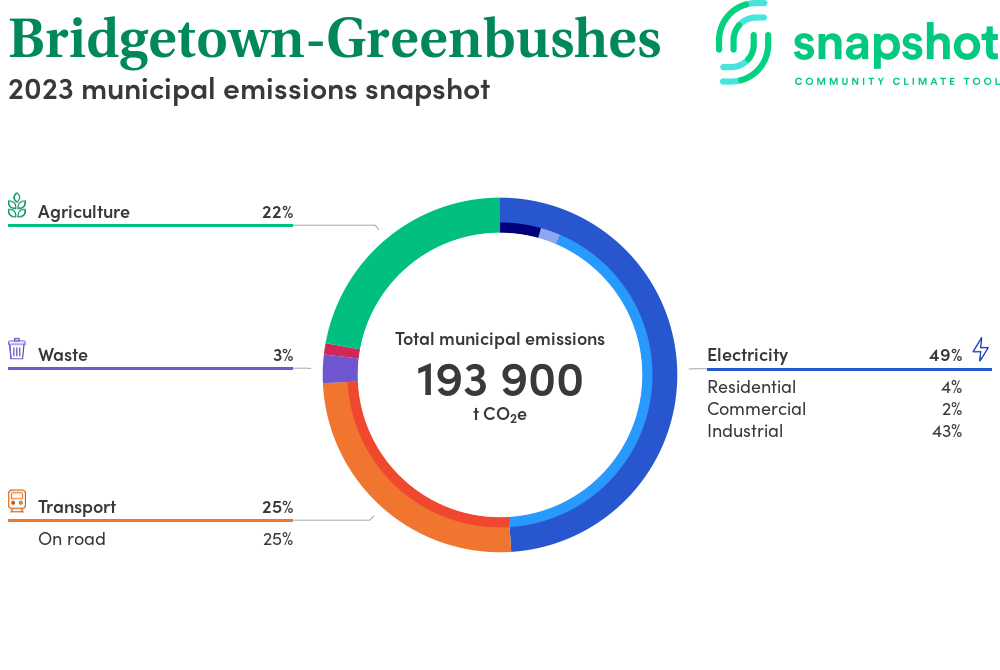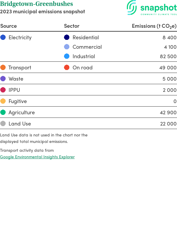 Bridgetown-Greenbushes is a rural municipality that is geographically small relative to the state average and has a moderate urban density. Its major emissions source is electricity consumption with the majority of this coming from industrial electricity consumption.
