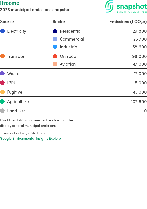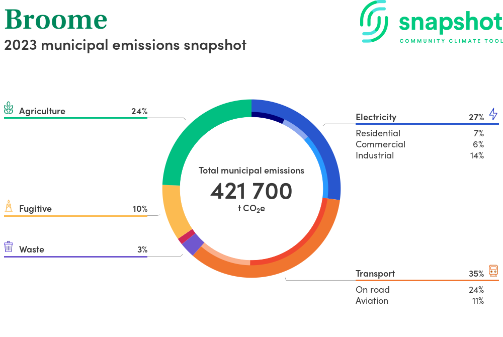 Broome is a rural municipality that is very large in geographical area relative to the state average and has a low urban density. Its major emissions source is electricity consumption, due to the community’s scale of population and commercial activity. The second largest source of emissions is agriculture.