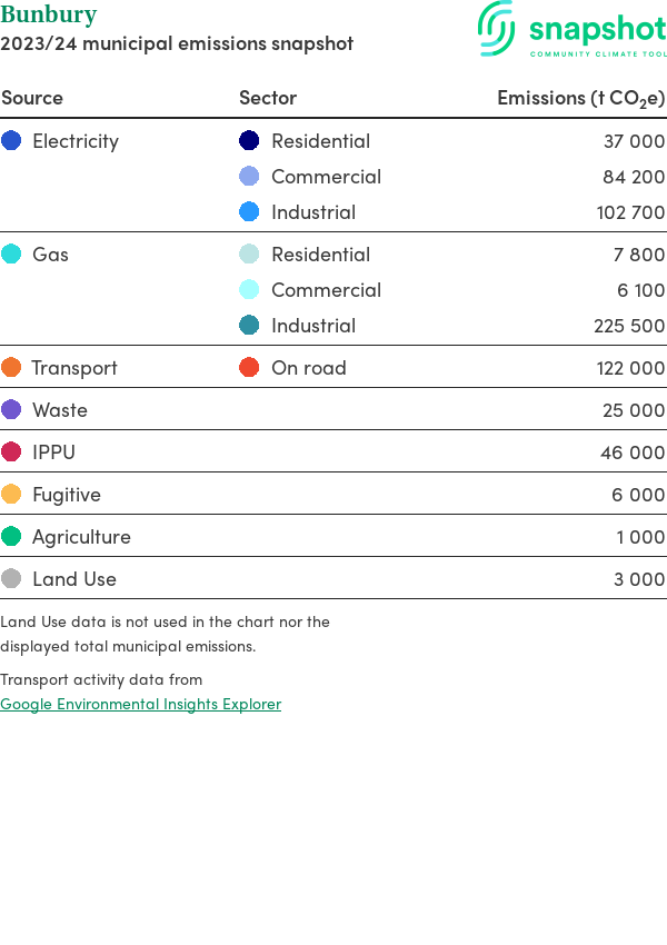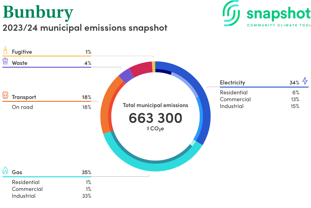 Bunbury is a city that is geographically very small relative to the state average and has a high urban density. Its major emissions source is gas consumption, due to the community’s relatively large population and commercial activity. The second largest source of emissions is industrial gas consumption.