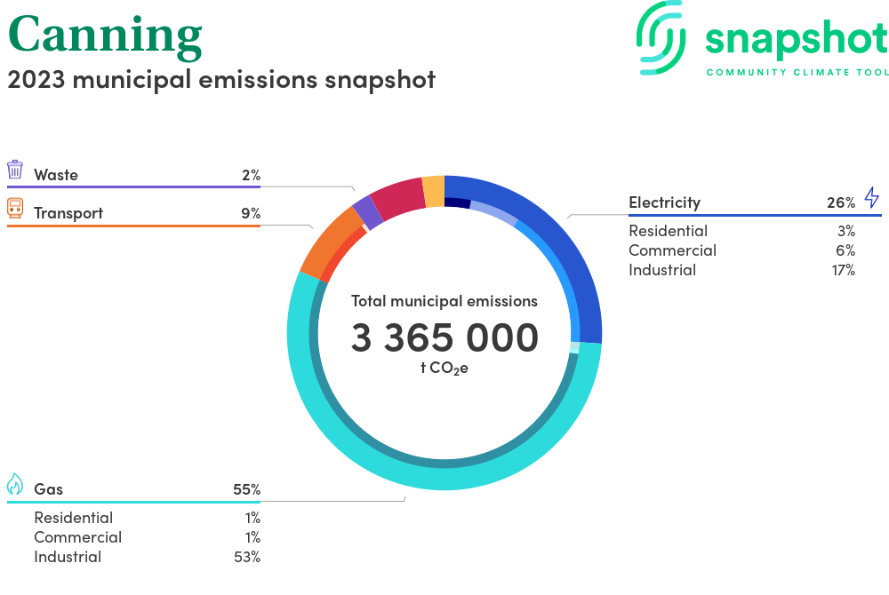 Canning is a city that is geographically very small relative to the state average and has a high urban density. Its major emissions source is gas consumption, due to the community’s relatively large population and commercial activity. The second largest source of emissions is industrial gas consumption.