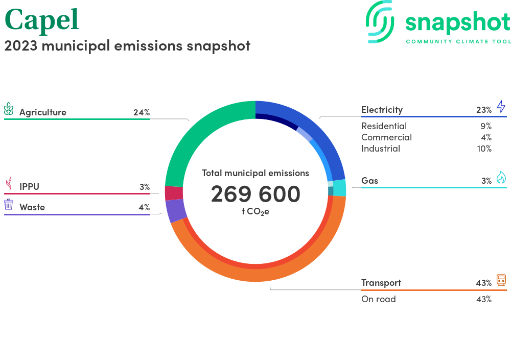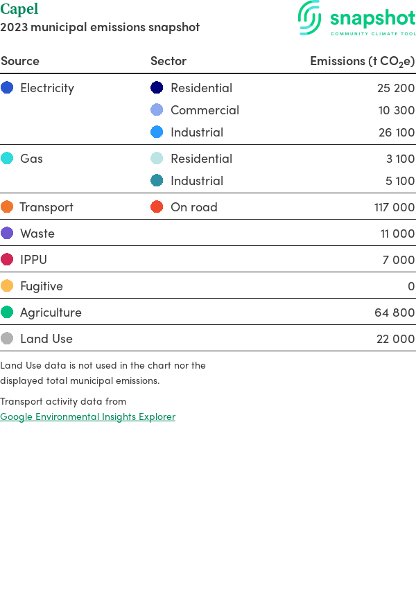 Capel is a rural municipality that is geographically small relative to the state average and has a high urban density. Its major emissions source is on road transportation, due to the community’s larger commuting and other travel requirements. The second largest source of emissions is agriculture.